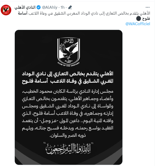 ونعاه النادي الأهلي اللاعب الشاب، صاحب الـ 24 عامًا، وكتب: "يتقدم بخالص التعازي إلى نادي الوداد المغربي الشقيق في وفاة اللاعب أسامة فلوح".