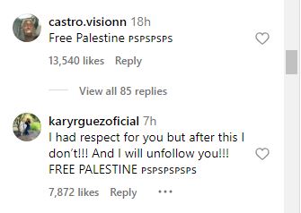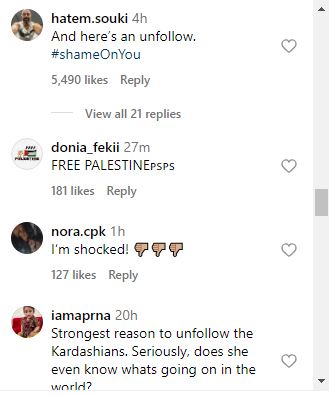 " لقد كنت أحترمك ولكن بعد هذا لم أفعل ذلك!!! وسوف ألغي متابعتك !!! فلسطين حرة "، "اسم طفلك ليس القديس، لكن المجنون! الرجاء فتح عيونك كيم، هذا ليس زومبي، هكذا يبدو شكل الأطفال في فلسطين".
