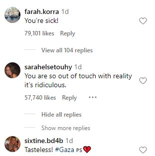 وسرعان ما انهالت عليها التعليقات الهجومية على الصور من قبل متابعيهما على موقع تبادل الصور والفيديوهات الشهير "إنستجرام"، وشلمت تلك الإنتقادات الآتي:" طعم سيء للغاية"، "أتمنى أن تشعري يوما ما بالألم مثل أمهات فلسطين، إلغاء المتابعة للنساء المريضات "، " أنت بعيد كل البعد عن الواقع وهذا أمر مثير للسخرية ".