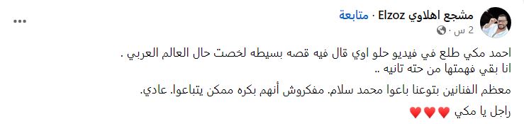 «أحمد مكي طلع في فيديو حلو أوي قال فيه قصه بسيطه لخصت حال العالم العربي، أنا بقى فهمتها من حته تانيه معظم الفنانين بتوعنا باعوا محمد سلام، مفكروش أنهم بكره ممكن يتباعوا، عادي، راجل يا مكي».