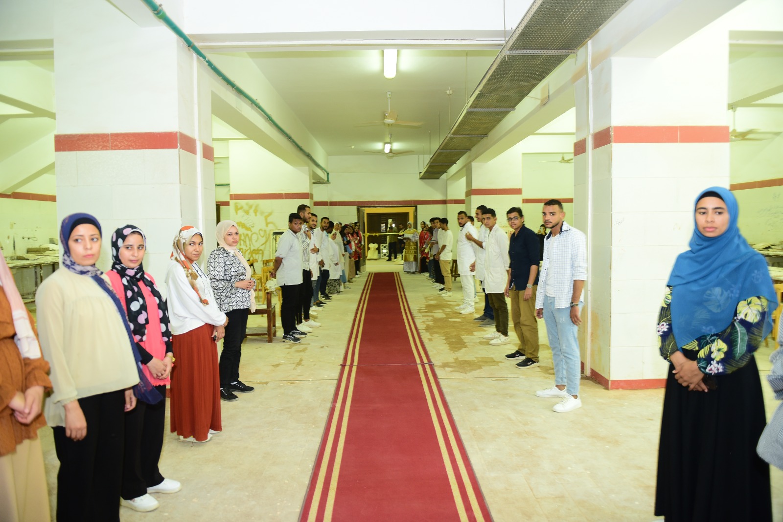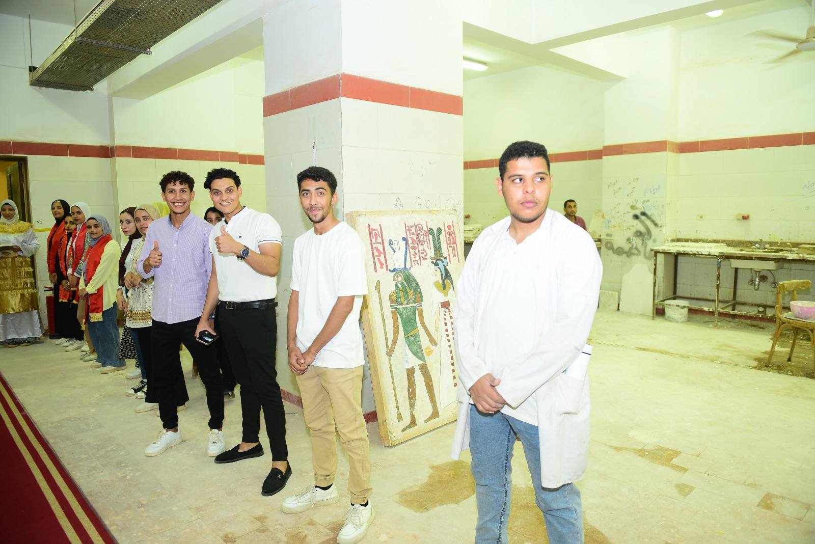 وأوضح الدكتور فهيم حجازي عميد الكلية أن رئيس الجامعة تفقد خلال جولته مجموعه من نماذج لتماثيل الكباش ونماذج لتماثيل ميريت آمون بالمعمل تمت تحت إشراف الدكتور محمد عوض أستاذ الترميم و الدكتور محمود أبو الفتوح السيد مدرس الترميم المعماري بالكلية، والدكتور حسام رجب سليم مدرس مساعد بالكلية، والدكتور عبد الناصر علي معيد بقسم الترميم وطلاب الفرقة الثالثة، كما تفقد ايضاً نماذج للوحات جدارية ولوحات زيتية وتماثيل وتابوت ضخم يزن حوالي طن تقريباً بمدخل الكلية.