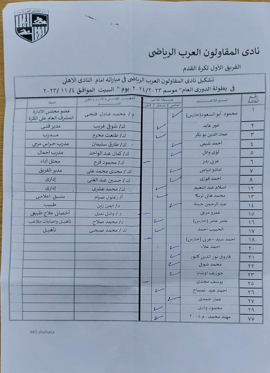 جاء تشكيل المقاولون العرب لمباراة الأهلي على النحو الآتي: