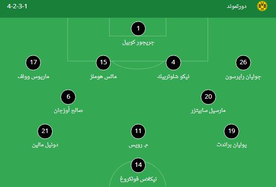 الدفاع: جوليان رايرسون، نيكو شلوتربيك، ماتس هوملز، ماريوس وولف.