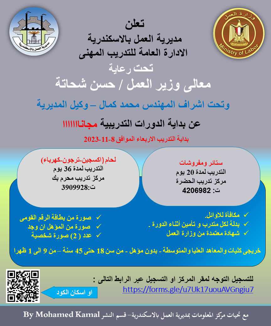 أعلنت وزارة العمل عن بدء مديرية العمل بمحافظة الأسكندرية فى فتح باب التسجيل للحصول على الدورات التدريبية المجانية  للشباب من الجنسين من أبناء المحافظة والمقيمين فيها الراغبين فى التدريب على مهن لحام الأكسجين والارجون، والكهرباء ـ وتصنيع الستائر والمفروشات، ضمن خطة التدريب المهنى للعام 2023 – 2024 ، وتحت إشراف الإدارة المركزية للتدريب المهنى بالوزارة.
