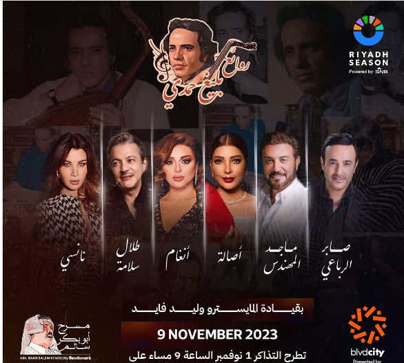 يقام حفل روائع بليغ حمدي يوم الأربعاء 8 نوفمبر على مسرح أبو بكر سالم بالعاصمة السعودية الرياض، مع نجوم الغناء من السعودية ومصر وسوريا، ومنها: “أنغام، أصالة، صابر الرباعي، طلال سلامة، نانسي عجرم، ماجد المهندس”.