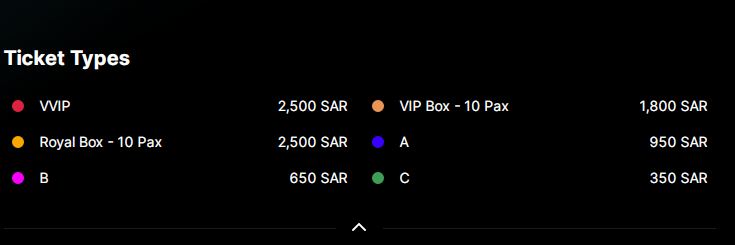 طُرحت تذاكر الحفل بعدد من الفئات التي تراوحت أسعارها بين 350 - 2500 ريال، وتم طرحها عبر الموقع الإليكتروني الخاص بها.