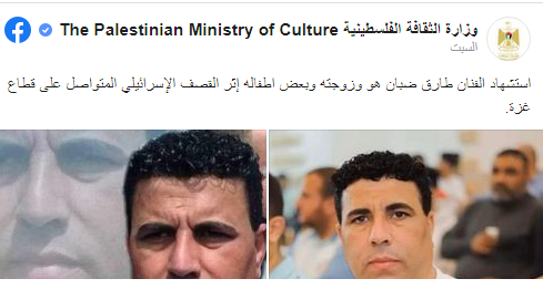 إذ أعلنت وزارة الثقافة الفلسطينية استشهاد الفنان الفلسطيني طارق ضبان وزوجته، بسبب القصف الإسرائيلي المتواصل على قطاع غزة، كما أعلنت الوزارة من خلال الصفحة الرسمية على موقع التواصل الاجتماعي " فيسبوك" استشهاد عائلة الكاتب والمخرج رياض عبد الرحمن، ومنهم زوجته وأبناؤه وبعض بناته بسبب القصف الإسرائيلي.