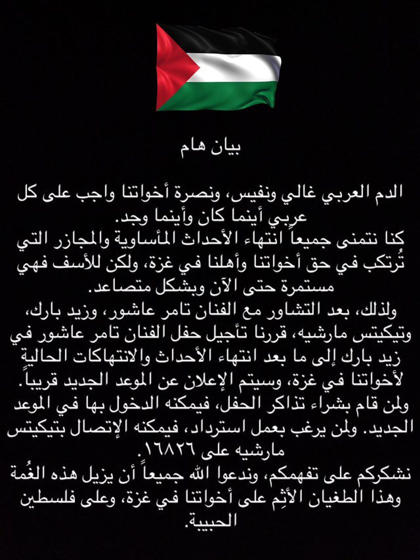 واستكمل البيان “ولذلك بعد التشاور مع الفنان تامر عاشور قررنا تأجيل الحفل إلى مابعد انتهاء الأحداث والانتهاكات الحالية لاخواتنا في غزة، وسيتم الإعلان عن الموعد الجديد قريبًا”.