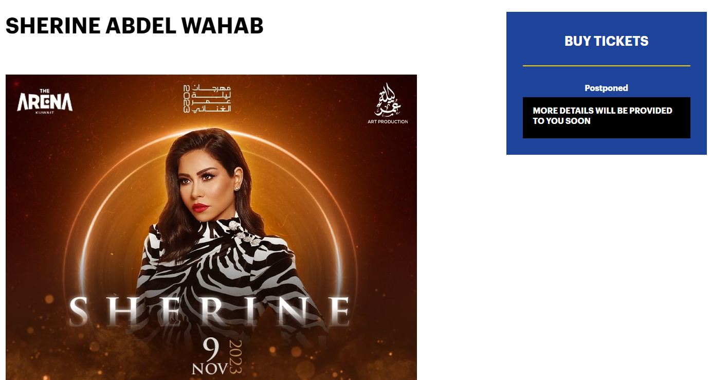 إضافةً إلى حفل الفنانة شيرين الذي تم تأجيله في الكويت، وذلك ضمن فعاليات مهرجان ليلة عمر الغنائي، الذي تم إلغاء عدد كبير من فعالياته في مطلع أكتوبر الماضي بالتزامن مع الاحداث الفلسطينية الدامية.