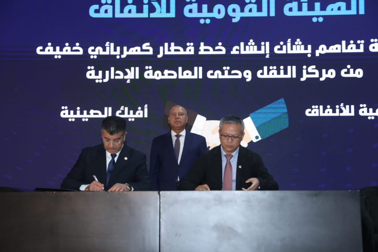 وشهد وزير النقل توقيع مذكرة تفاهم لتنفيذ أعمال مشروع قطار كهربائي خفيف من الرحاب الى العاصمة الادارية الجديدة - بين الهيئة القومية للأنفاق وشركة أفيك أنترناشيونال القابضة الصينية(أفيك أنتل) حيث يمتد المشروع من مركز النقل بمحطة الرحاب التبادلية بالمرحلة الثانية للخط الرابع للمترو وصولاً الى العاصمة الإدارية بمنطقة R3 بجوار محطة المونوريل بطول حوالى 40 كم وعدد 8 محطات ومحطة تغذية رئيسية وعدد من محطات التغذية الفرعية والورشة وتوريد القطارات ، وقد قام بالتوقيع من الجانب المصـرى الدكتور مهندس/ طارق جويلى رئيس الهيئة القومية للأنفاق ومن جانب الشركة الصينية السيد / يو لى – رئيس شركة أفيك الصينية .