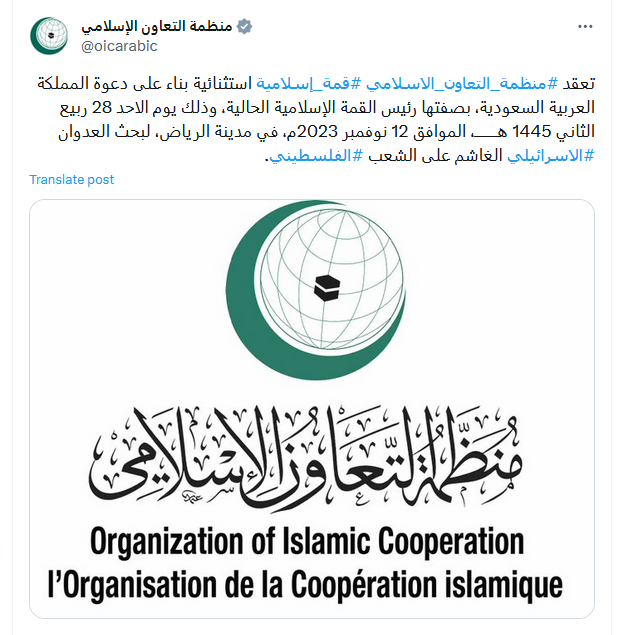ووفق لحساب منظمة التعاون الإسلامي الرسمي بموقع "إكس" تويتر سابقًا، فقد دعت السعودية إلى انعقاد القمة بصفتها رئيس القمة الإسلامية الحالية، لبحث العدوان الإسرائيلي الغاشم على الشعب الفلسطيني.