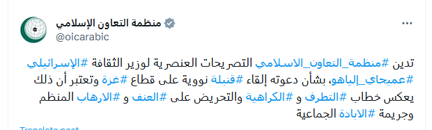 وكانت منظمة التعاون الاسلامي ادانة التصريحات العنصرية لوزير الثقافة الإسرائيلي عميحاي إلياهو، بشأن دعوته إلقاء قنبلة نووية على قطاع غزة وتعتبر أن ذلك يعكس خطاب التطرف والكراهية والتحريض على العنف و الارهاب المنظم وجريمة الابادة الجماعية.