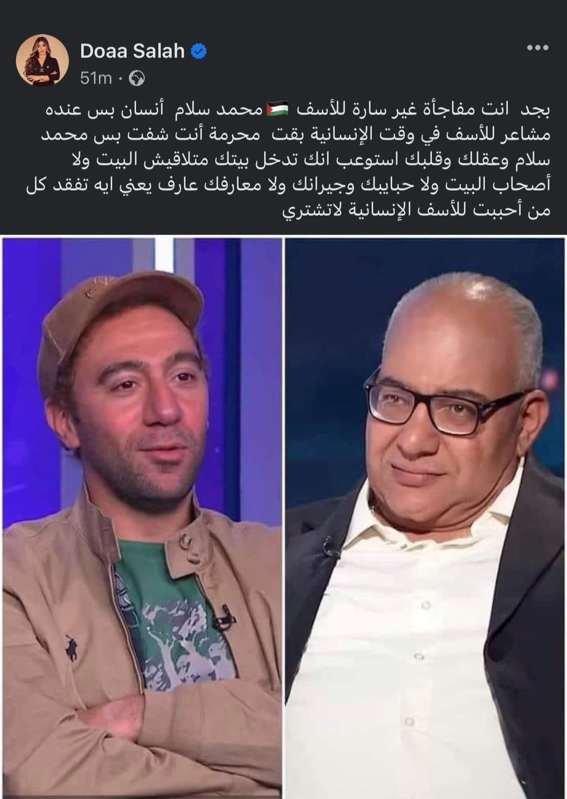 وكانت الإعلامية دعاء صلاح، ضمن الذين هاجموا الفنان بيومى فؤاد وذلك بعد نتقاده للفنان محمد سلام لعدم مشاركته فى مسرحية زواج إصطناعى، والذى يعرض فى موسم الرياض بالمملكة العربية السعودية، وجاء ذلك خلال منشور عبر حسابها بموقع "فيس بوك"، وقالت خلاله: "بجد انت مفاجأة غير سارة، للأسف محمد سلام أنسان بس عنده مشاعر ، للأسف في وقت الإنسانية بقت محرمة ".
