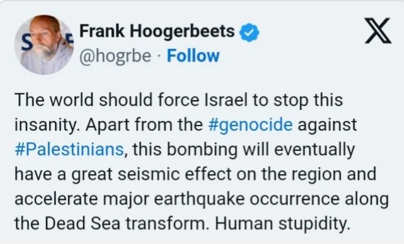ففي تغريدة نشرها العالم الهولندي فرانك هوجربيتس على منصة إكس "تويتر سابقًا" حذر من وقوع زلزال مدمر خلال الفترة المقبلة نتيجة للكم الهائل من المتفجرات التي قصفتها إسرائيل على غزة منذ اندلاع الحرب في 7 أكتوبر، مؤكدا أن ذلك قد يؤدي إلى زلزال كبير بالمنطقة.