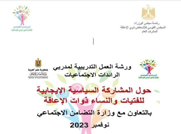 بالتعاون مع وزارة التضامن الاجتماعي، نظم المجلس القومي للإعاقة، ورشة عمل تدريبية لمدربي الرائدات الاجتماعيات عبر تقنية zoom، حول المشاركة السياسية الإيجابية للفتيات والنساء ذوات الإعاقة في الانتخابات الرئاسية 2024
