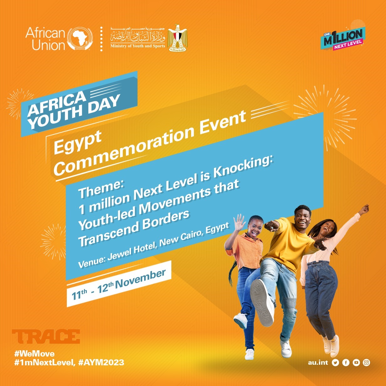 تطلق وزارة الشباب والرياضة من خلال الإدارة المركزية لتمكين الشباب ووحدة السياسات وتطوير الأعمال بالوزارة، بالتعاون مع الاتحاد الأفريقي مبادرة " المستوى المليون التالي 1 Million Next level "  لتعزيز دور الشباب المصري في تنمية القارة الافريقية، في إطار يوم الشباب الأفريقي.