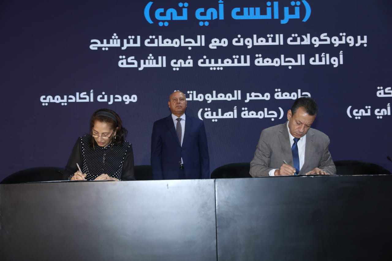 وشهد الوزير  ايضا توقيع بروتوكول تعاون بين شركة تكنولوجيا معلومات النقل (ترانس آي تي) الذراع التكنولوجي لوزارة النقل وجامعه مودرن أكاديمي احدي الجامعات المصرية بشأن التدريب الميداني لاوائل كلية علوم الكمبيوتر وتكنولوجيا الادارة وتأهيلهم لسوق العمل والاستفادة من الاكاديمية في دعم البحث العلمي للشركة، حيث قام بالتوقيع كل من المهندس خالد عطية رئيس مجلس ادارة شركة تكنولوجيا معلومات النقل (ترانس آي تي) الذراع التكنولوجي لوزارة النقل و الدكتور / محمود السيد عميد مودرن اكاديمي.