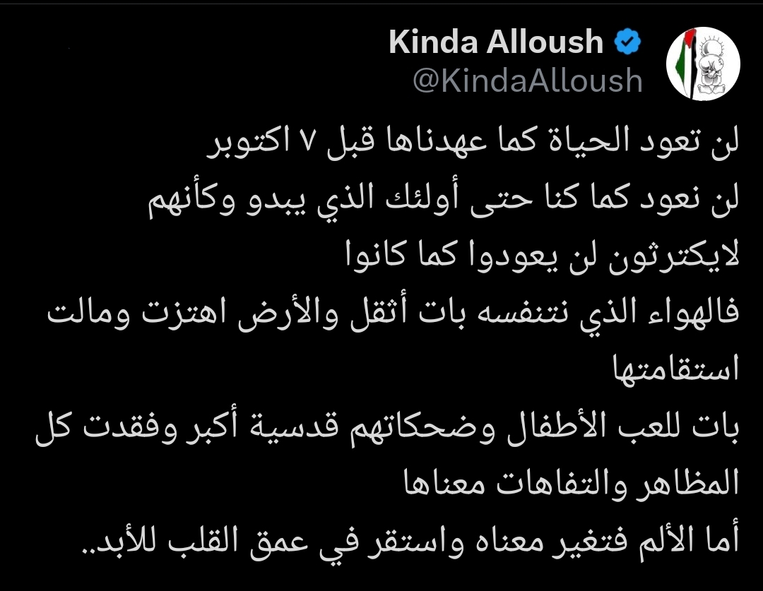 كنده علوش: لن تعود الحياة كما عهدناها قبل 7 أكتوبر