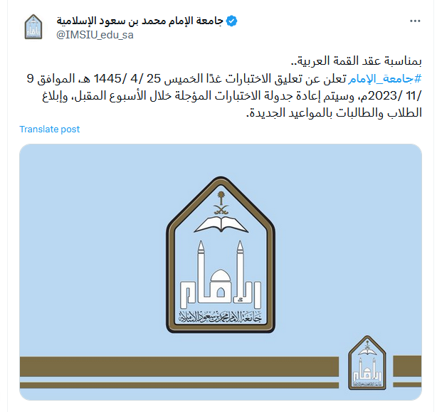 وفي نفس السياق أعلنت جامعة الإمام محمد بن سعود الإسلامية تعليق الاختبارات غدًا الخميس الموافق 25 ربيع آخر 1445هـ/ 9 نوفمبر 2023م.