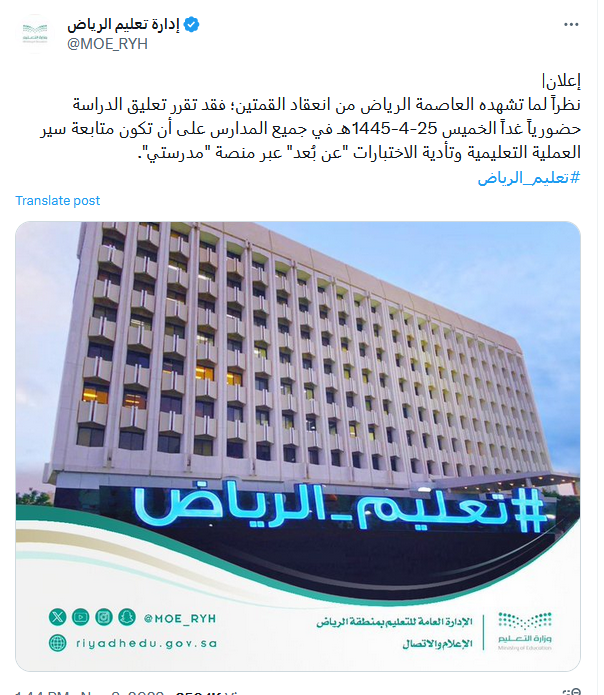 وقالت إدارة تعليم الرياض عبر حسابها الرسمي بموقع التواصل الاجتماعي "إكس" تويتر سابقًا: "نظرًا لما تشهده العاصمة الرياض من انعقاد القمتين؛ فقد تقرر تعليق الدراسة حضوريًّا غدًا الخميس في جميع المدارس على أن تكون متابعة سير العملية التعليمية وتأدية الاختبارات “عن بُعد” عبر منصة مدرستي".