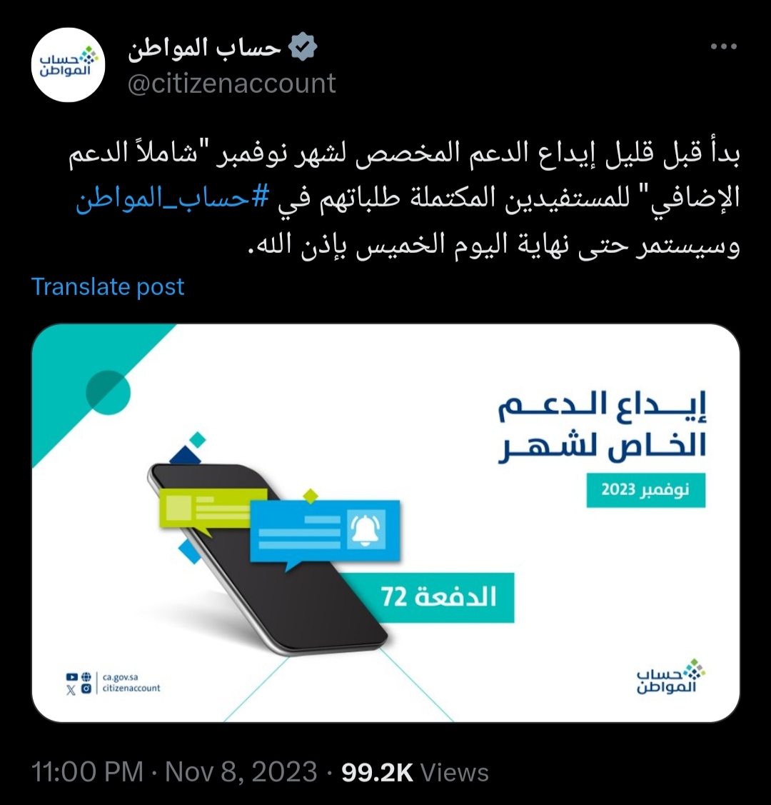ونشر حساب المواطن عبر صفحته الرسمية بموقع التواصل الاجتماعي "إكس" تويتر سابقا، بدء إيداعه لدعم الشهر الحالي منذ قليل، وعلق:"بدأ قبل قليل إيداع الدعم المخصص لشهر نوفمبر،شاملاً الدعم الإضافي للمستفيدين المكتملة طلباتهم في حساب المواطن وسيستمر حتى نهاية اليوم الخميس".