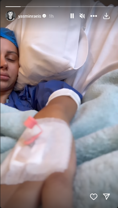 وظهرت ياسمين رئيس في الصور مستلقية على سرير وفي يدها كانيولا، وعلامات التعب تظهر على وجهها .