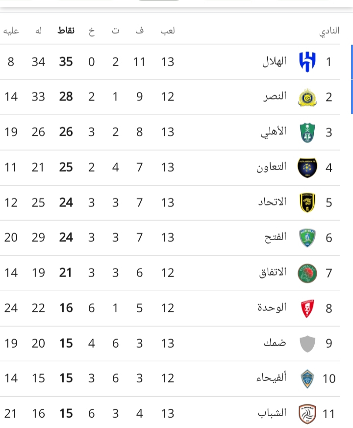 بينما يأتي الهلال في صدارة ترتيب المسابقة برصيد 35 نقطة، ويحل النصر في الوصافة ب 28 نقطة.