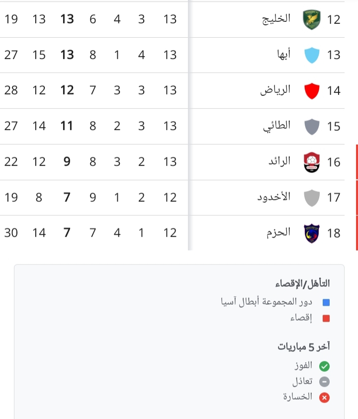 فيما يأتي الأهلي ثالثًا في جدول الترتيب ب 26 نقطة، والتعاون في المركز الرابع ب 25، واتحاد جدة خامسًا ب 24 نقطة.