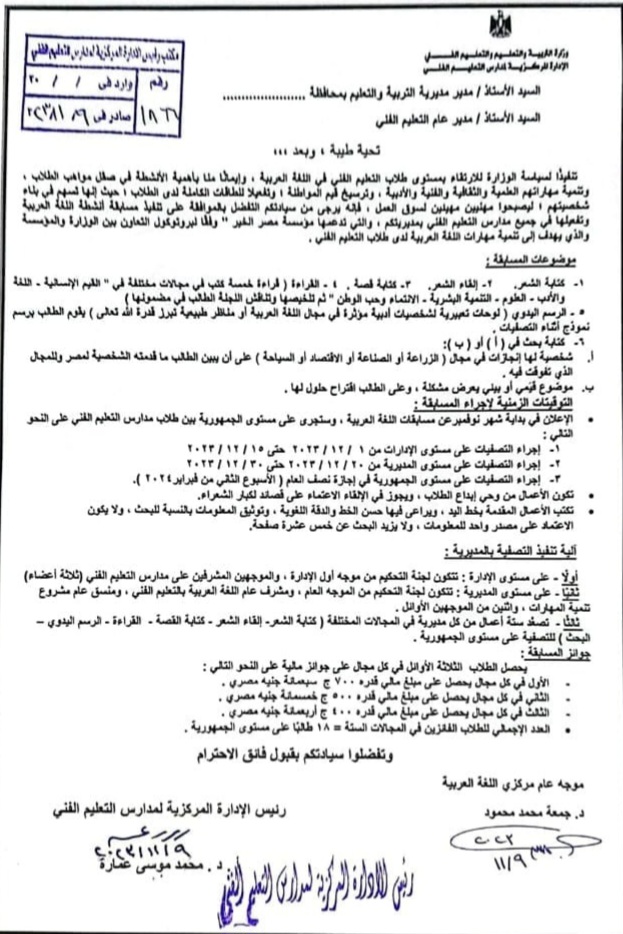 تعلن وزارة التربية والتعليم عن مسابقات اللغة العربية في بداية شهر نوفمبر، وتجرى على مستوى الجمهورية بين طلاب مدارس التعليم الفني على النحو الآتي:
