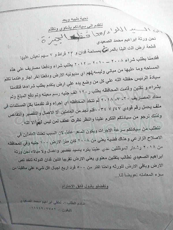 منذ أكثر من 90 عامًا يعيش ورثة إبراهيم الصعيدي في منطقة كفر غطاطي بمدينة الهرم في محافظة الجيزة، ووصل تعدادهم لأكثر من 50 أسرة، وفي ظل الأوضاع والقوانين الجديدة اتجه الأهالي إلى الإصلاح الزراعي، التابع لوزارة الزراعة، من أجل تقنين أوضاعهم، وبالفعل قاموا بدفع الرسوم المقررة لتصبح الأرض التي أقاموا عليها منازلهم الصغيرة ليعيشون فيها ملكًا لهم بعد تقنين أوضاعهم.