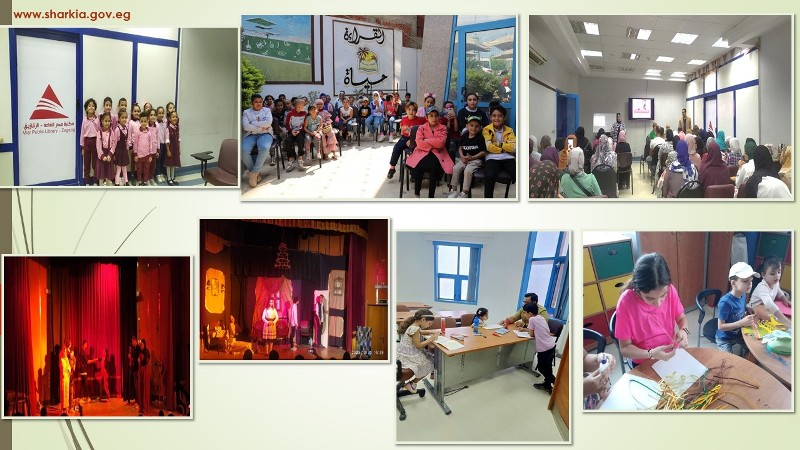 كما قامت المكتبة أيضاً بتنظيم عروض مسرحية بعنوان "الحية والحاوى - مطلوب مخرج" بمشاركة 260 عضوا من الشباب والكبار، فضلاً عن تنظيم ندوات بعنوان (عيون البيئة - الاكتشاف المبكر لأمراض الدم للأطفال )، بالإضافة لاستقبال 65 طفلا لقضاء يوم ترفيهى بالمكتبة، وذلك من حضانة طلبة عويضة ووحدة امراض الدم بجامعة الزقازيق، كما تم تنظيم يوم ترفيهى لأعضاء المكتبة شارك فيه 50 طفلا.