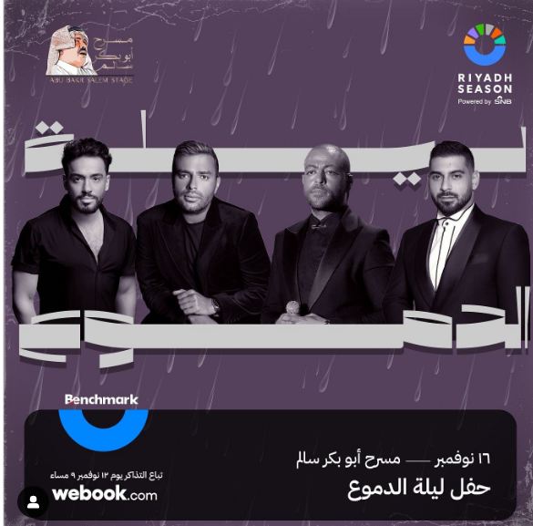 ومن المقرر أن يقام الحفل يوم الخميس 16 نوفمبر، مع نجوم مصر “تامر عاشور، رامي جمال، رامي صبري، واللبناني آدم”، على مسرح أبو بكر سالم بالرياض.