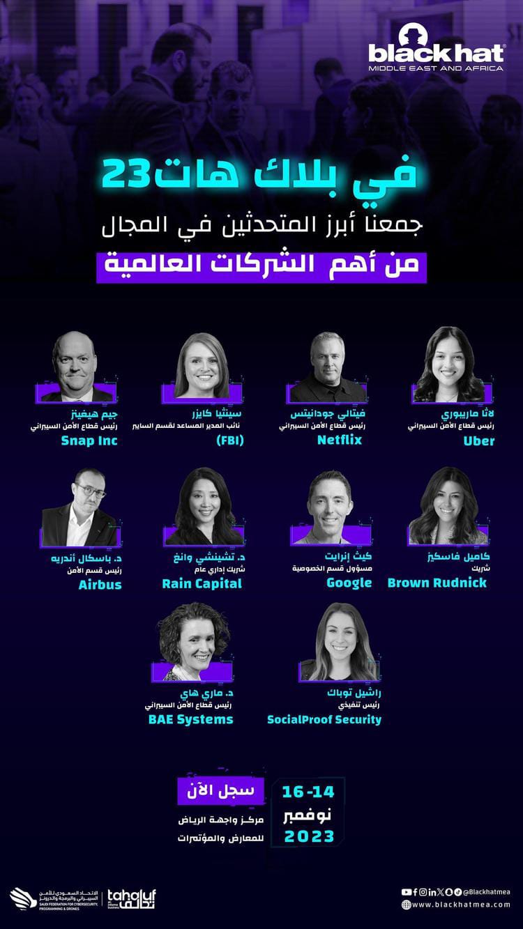 وتستضيف الفعالية نخبة من المتحدثين الخبراء في قطاع الأمن السيبراني من كبرى الشركات العالمية مثل: أوبر، وSnap Inc، وآبل، وZoom، وجوجل ، وCoinbase ، وBoom ، وAirBus ، وBae Systems، وSocialProof Security، والعديد من الشركات العالمية الأخرى.