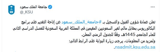 ونشرت جامعة الملك سعود عبر صفحتها الرسمية بموقع التواصل الاجتماعي "تويتر"، رابط التقديم على برامج البكالوريوس لهذا العام قائلة:" تعلن عمادة شؤون القبول والتسجيل بجامعة الملك سعود عن إتاحة التقديم على برامج البكالوريوس بمقابل مالي لغير السعوديين المقيمين في المملكة العربية السعودية للفصل الدراسي الثاني للعام الجامعي 1445هـ، وفقًا للجدول الزمني المعلن"، داعية الراغبين في التقديم الاطلاع على تفاصيل التقديم عبر الرابط التالي.. http://nsadmit.ksu.edu.sa