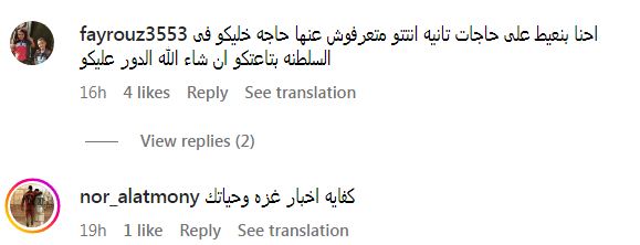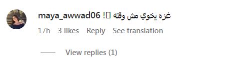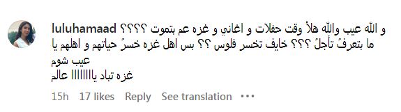 “والله عيب والله هلأ وقت حفلات وأغاني وغزة عم بتموت مابتعرف تاجل خايف تخسر فلوس بس أهل غزة خسروا حياتهم وأهلهم ياعب الشوم غزة تباد ياعالم”
