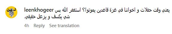 “يعني وقت حفلات واخواننا في غزة قاعدين يموتوا؟ استغفر الله بس شي يكسف ويزعل حقيقي”