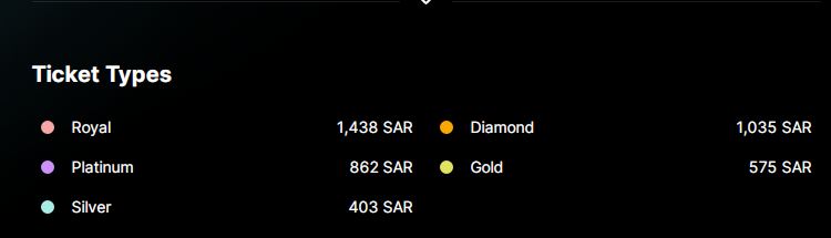 تراوحت أسعار تذاكر حفل وائل كفوري وإليسا بين 403 - 1438 ريال سعودي، وتم طرحها عبر الموقع الإليكتروني الخاص بها.