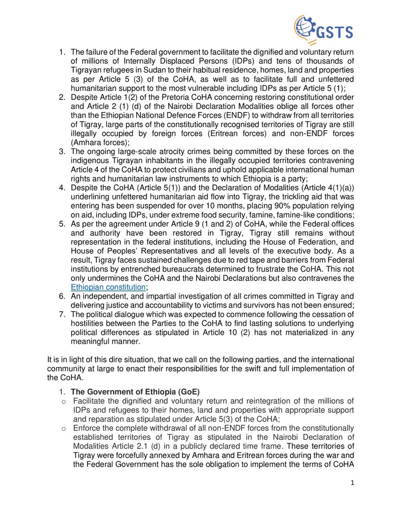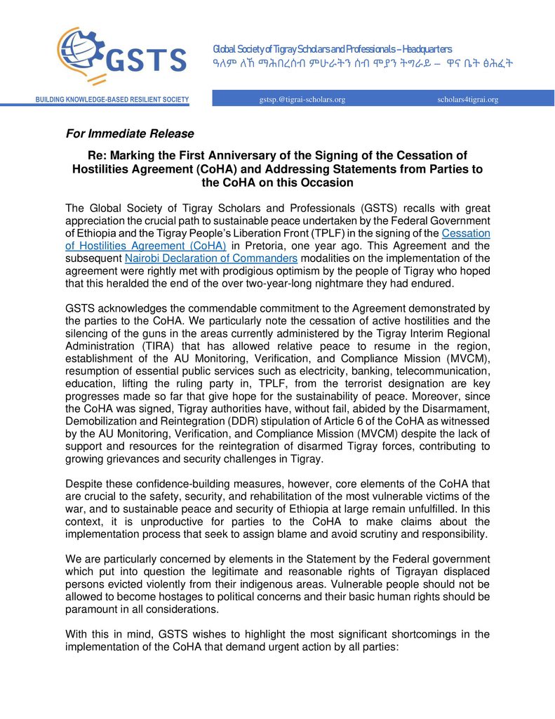 ناشدت الجمعية العالمية لعلماء ومهنيي تيغراي، المجتمع الدولي إجراء تقييم سريع لحالة تنفيذ اتفاقية وقف الأعمال العدائية ووضع جميع الأدوات للضغط على الموقعين من أجل التنفيذ الكامل للاتفاقية التي وقعوها.
