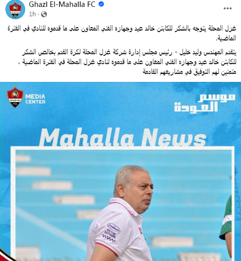 “يتقدم المهندس وليد خليل - رئيس مجلس إدارة شركة غزل المحلة لكرة القدم بخالص الشكر للكابتن خالد عيد وجهازه الفني المعاون على ما قدموه لنادي غزل المحلة في الفترة الماضية، متمنين لهم التوفيق في مشاريعهم القادمة”.