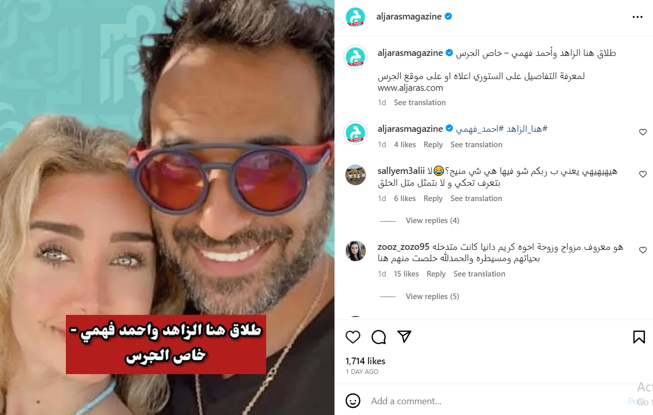 كانت انتشرت في الساعات الأخيرة أنباء عدة تفيد بطلاق النجمين هنا الزاهد وأحمد فهمي، بعدما زعمت الإعلامية نضال الأحمدية بوقوع الانفصال رسميًا من خلال منشور شاركته على الصفحة الرسمية لموقع مجلتها "الجرس" على "إنستجرام"، الأمر الذي أثار حيرة وصدمة الجمهور متسائلين عن حقيقة الأمر.