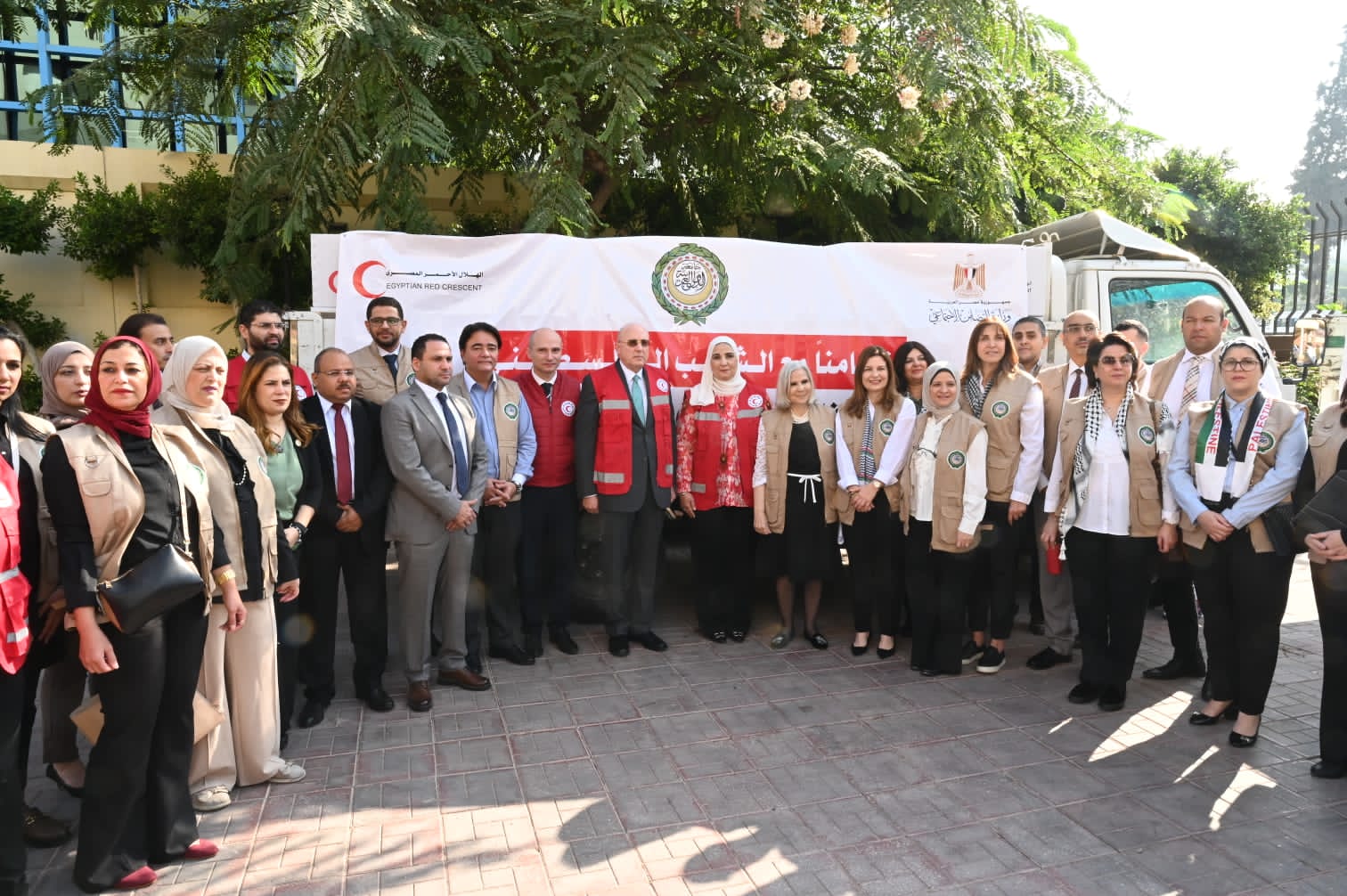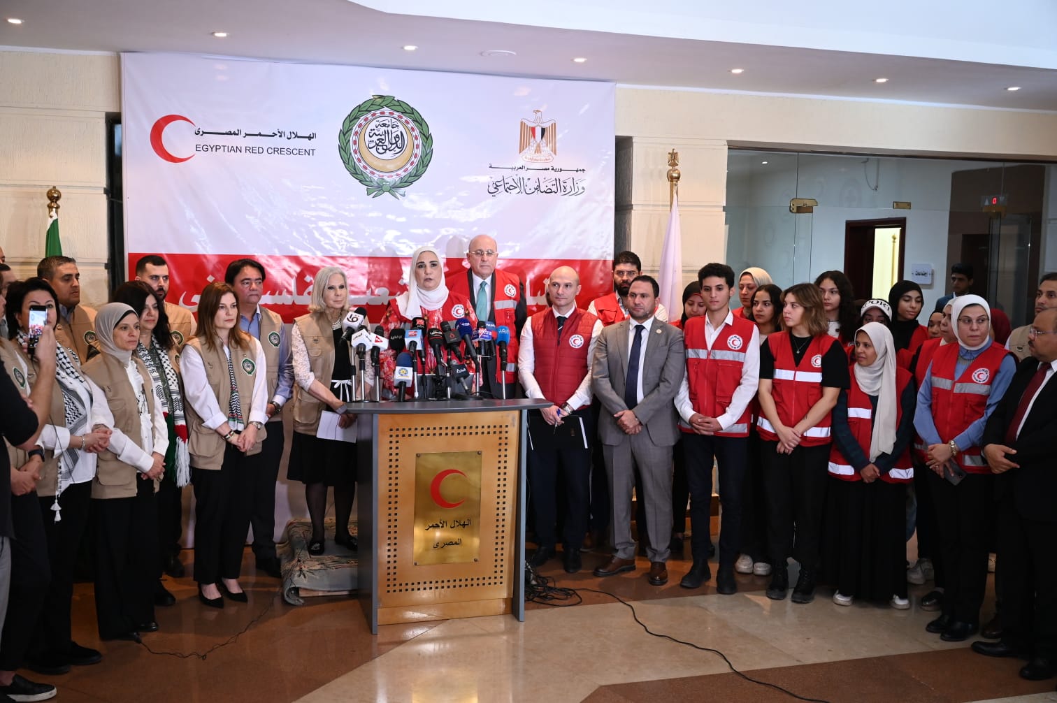 دشنت نيفين القباج وزيرة التضامن الاجتماعي والسفيرة هيفاء أبو غزالة الأمين العام المساعد ورئيس قطاع الشئون الاجتماعية بجامعة الدول العربية من مقر الهلال الأحمر المصري بالقاهرة قافلة المساعدات الإنسانية الإغاثية المقدمة من مجلس وزراء الشئون الاجتماعية العرب إلى قطاع غزة عبر الهلال الأحمر المصري، وذلك للتخفيف على أهالي القطاع من الكارثة الإنسانية غير المسبوقة التي يمرون بها جراء العدوان الإسرائيلي.