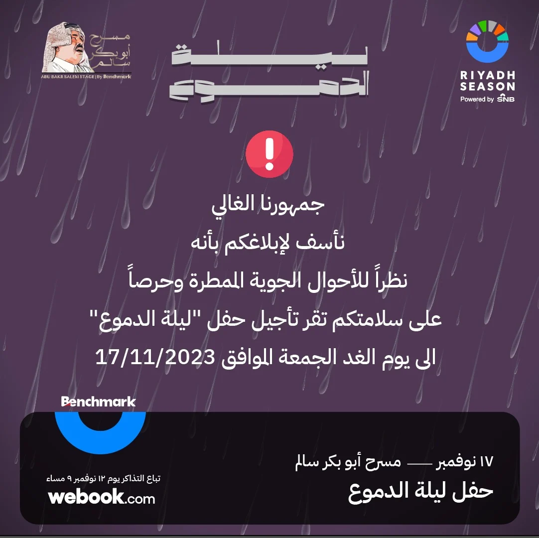 قرر القائمين على حفل ليلة الدموع، تأجيله بسبب سوء الأحوال الجوية، وذلك حسبما أعلنت الصفحة الرسمية لـ بنش مارك، والذي كان مقرر أن يقام مساء اليوم الخميس 16 نوفمبر ضمن فعاليات موسم الرياض بالمملكة العرية السعودية.