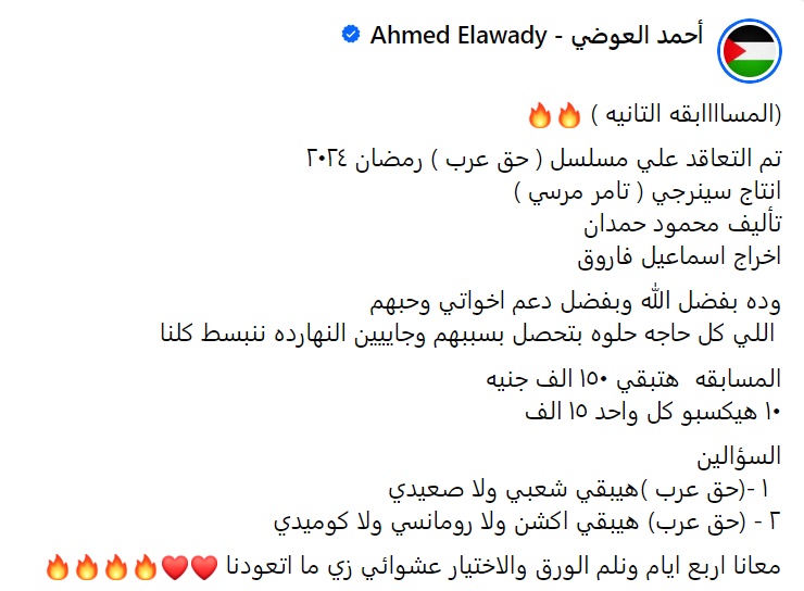 وفي سياق آخر.. أعلن الفنان أحمد العوضي، عن خوضه موسم دراما رمضان 2024 بمسلسل "حق عرب" حيث كتب العوضي، عبر حسابه على فيسبوك: “ تم التعاقد على مسلسل ”حق عرب" رمضان ٢٠٢٤، إنتاج سينرجي "تامر مرسي"، ومن تأليف محمود حمدان، إخراج إسماعيل فاروق.