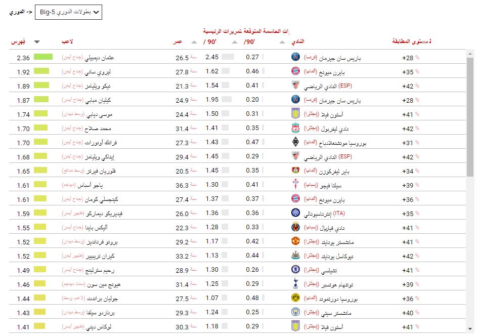 يتم أخذ بعين الاعتبار فقط لاعبي كرة القدم الذين لعبوا ما لا يقل عن 630 دقيقة في الدوري المحلي لنفس الفريق خلال الموسم الحالي.