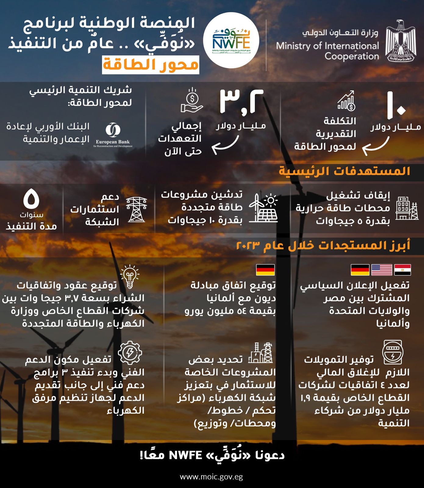 وأكد بيان وزارة التعاون الدولي، أن القطاع الخاص شريك رئيسي في تنفيذ مشروعات برنامج «نُوَفِّــي» ولا سيما في محور الطاقة ، تعزيزًا لرؤية الدولة وجهودها منذ عام 2014 لتعزيز مشاركة القطاع الخاص في مشروعات الطاقة، وفي هذا الصدد فقد تم التعاقد على مشروعات طاقة متجددة بقدرات ٣,٧ جيجاوات بين وزارة الكهرباء والطاقة المتجددة وشركات القطاع الخاص (مثل أكوا باور/ مصدر/ النويس/ أوراسكوم/ وغيرها)،