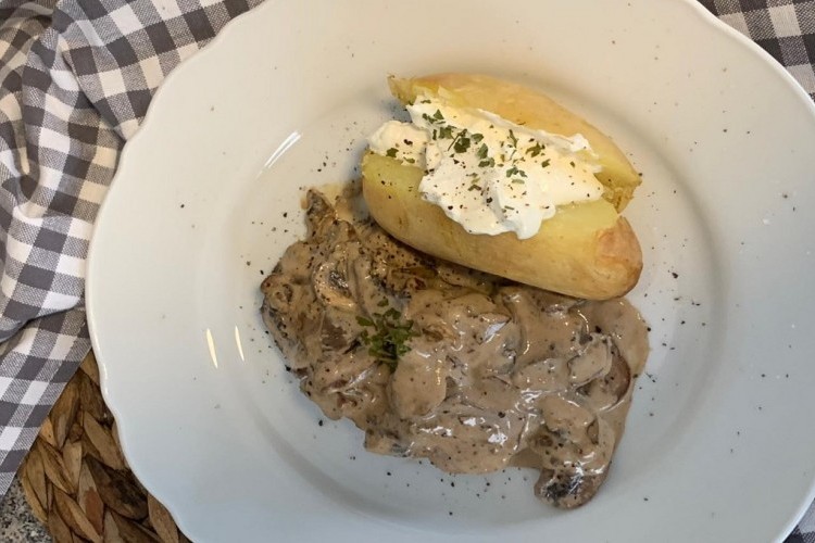 قدميه ساخناً مع البطاطس المشوية والكريمة الحامضة حسب الرغبة.