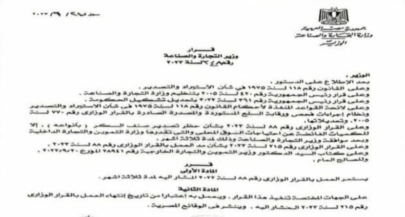 تدرس الحكومة تمديد الحظر المفروض على صادرات السكر الفائضة عن احتياجات السوق المحلية وهو القرار الذى أصدره وزير التجارة والصناعة المهندس أحمد سمير وزير الصناعة والتجارة ويحمل رقم 348 لسنة 2023 فى أواخر سبتمبر الماضى لمدة ثلاثة أشهر.