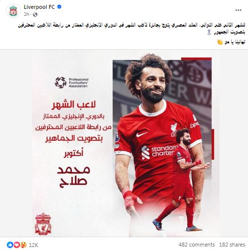 ونشرت الصفحة الرسمية لنادي ليفربول صورة لمحمد صلاح وعلقت: “تهانينا يا مو، للشهر الثاني على التوالي، الملك المصري يتوج بجائزة لاعب الشهر في الدوري الإنجليزي الممتاز من رابطة اللاعبين المحترفين بتصويت الجمهور”.