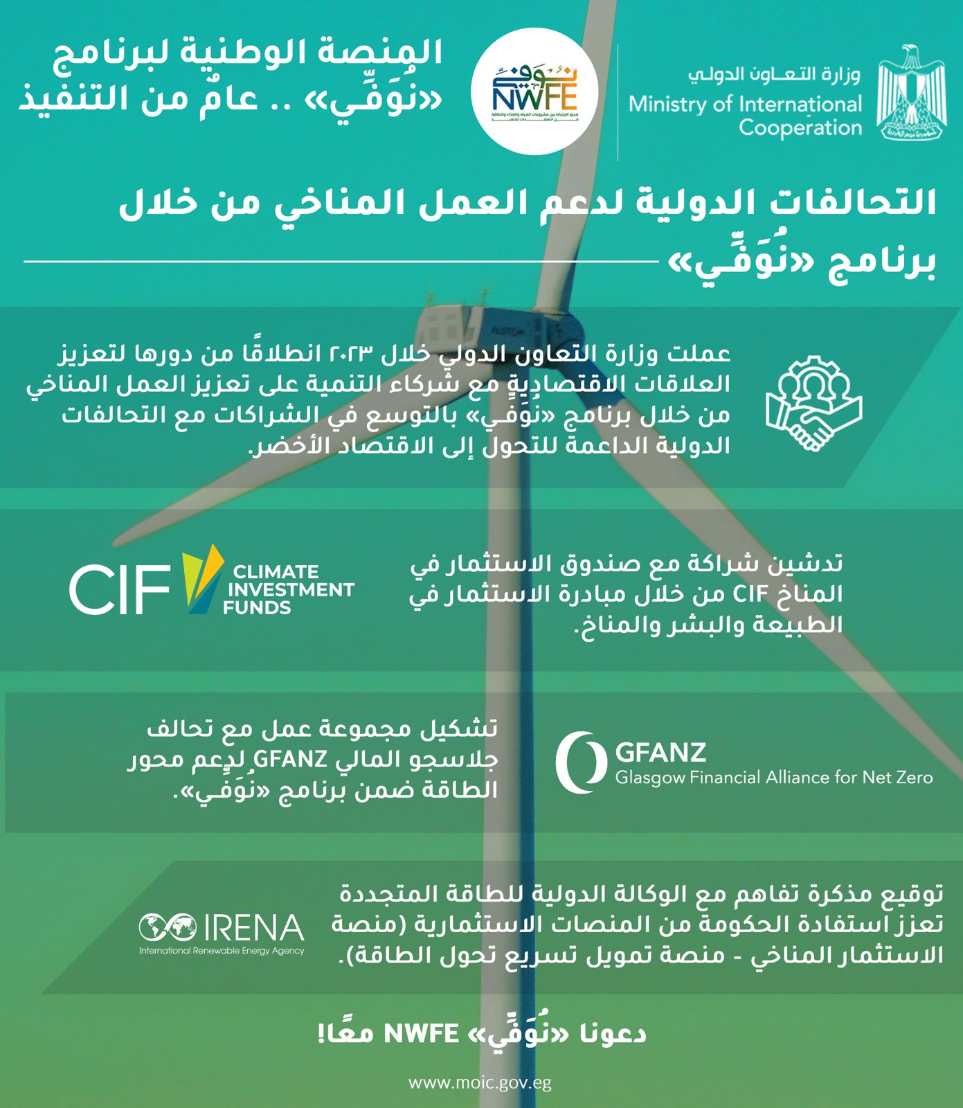 أطلقت الحكومة المصرية من خلال وزارة التعاون الدولي المشاورات مع الوكالة الدولية للطاقة المتجددة (IRENA) من أجل دعم الوكالة للعديد من مشروعات برنامج "نُوَفِّــي" من خلال المنصات للاستثمار في المناخ والخدمات الاستشارية الأخرى التي تقدمها الوكالة في مضمار الطاقة الجديدة والمتجددة، وذلك في إطار التواصل والتنسيق المستمر مع شركاء التنمية الثنائيين ومتعددي الأطراف من أجل تعزيز فرص مصر في الحصول على الدعم الفني والتمويلات الميسرة والاستثمارات من قبل القطاع الخاص.وقد تم ايفاد بعثة من الوكالة قبل مؤتمر المناخ بشرم الشيخ لبحث سبل التعاون المشترك في إطار المنصة الوطنية نوفي، وقد أثمرت جهود التنسيق المشتركة بين جمهورية مصر العربية من خلال وزارة التعاون الدولي والوكالة الدولية للطاقة المتجددة، في صياغة وتوقيع مذكرة تفاهم مشتركة لتمكين الحكومة المصرية من استخدام المنصات الاستثمارية، وهي منصة الاستثمار المناخي التي تعد مبادرة مشتركة بين الوكالة الدولية للطاقة المتجددة (إيرينا)، وبرنامج الأمم المتحدة الإنمائي (UNDP)، وبرنامج الطاقة المستدامة للجميع (SEforALL)، بالتعاون مع صندوق المناخ الأخضر (GCF). تتمثل مهمة CIP في زيادة تعبئة رأس المال والاستثمار في تأثير الطاقة المتجددة في البلدان النامية.