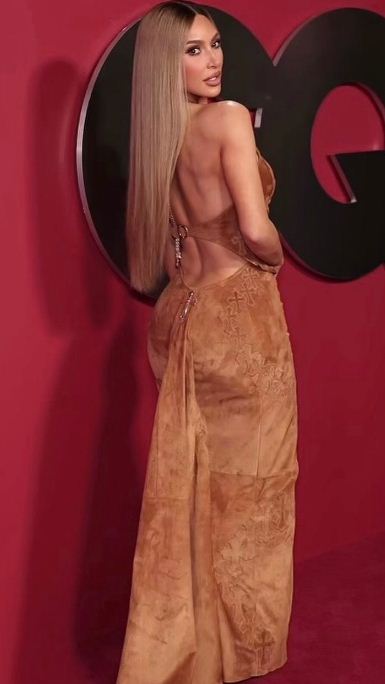 وبدت كيم بإطلالة أنوثية جرئية حيث ارتدت فستان طويل مجسم مكشوف الظهر صمم من قماش ناعم باللون البني وزين ببعض اكسسوارات الصليب بمختلف احجامه من الخلف.